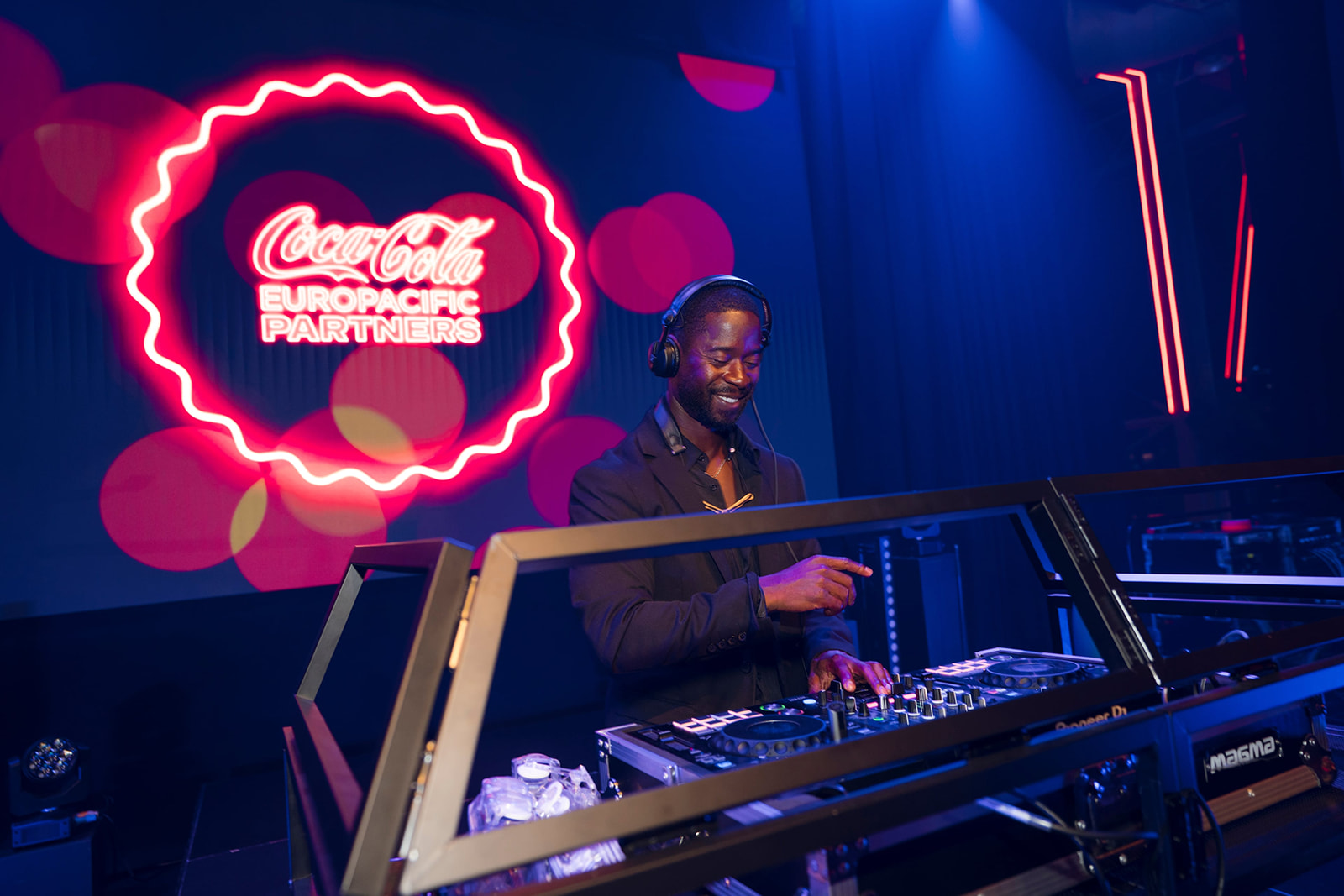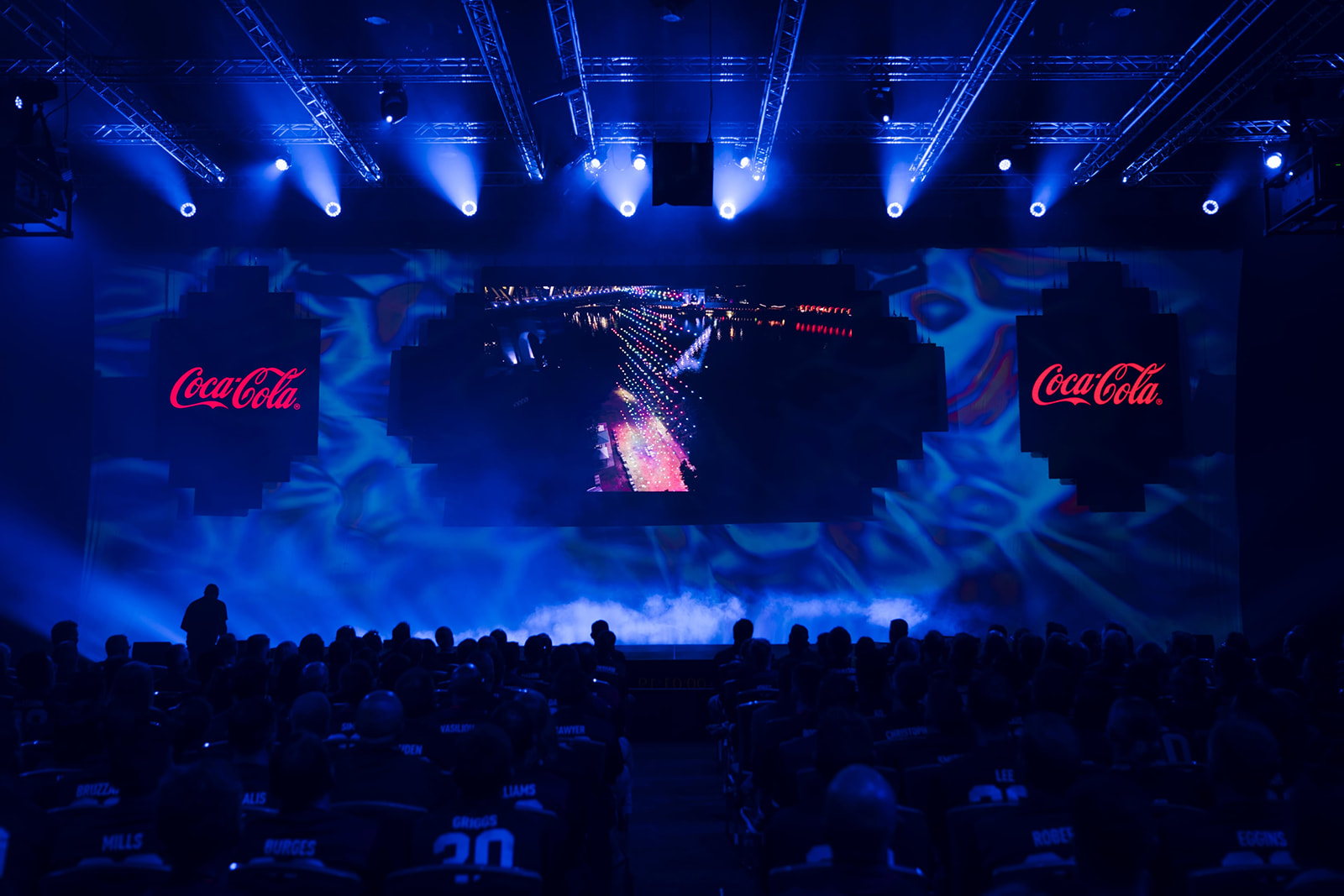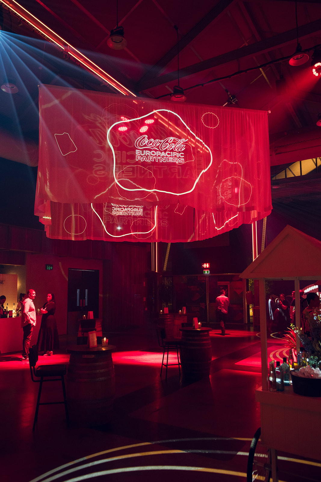 The event combined spectacular production and precise event management, with pyro effects, t-shirt cannons, a balloon drop, and a drone show creating memorable moments throughout. Three large LED screens, complemented by a 40-metre bespoke video projection, were designed in line with CCEP brand guidelines, ensuring content was displayed with maximum visual impact in a fully branded venue.